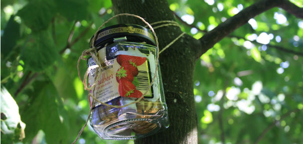Seitenwechsel: Jetzt möchte ich selber einen Cache verstecken. Ein Marmeladenglas ernenne ich zu meiner Schatztruhe, aber was kommt hinein? Goldmünzen aus Schoko-Kaubonbon dürfen nicht fehlen – da meldet sich das Kind in mir. Außerdem ein Spruch: „Wir suchen niemals die Dinge, sondern das Suchen nach ihnen.“Die Schatzsuche stimmt philosophisch. Und ein Brief an meine Caching-Kollegen mit der Aufforderung, einen anderen Begriff für „Muggel“ zu suchen und diesen aufzuschreiben. Dann kommt noch das selbstgebastelte obligatorische Logbuch in das Glas – Papierstreifen, die mit einem Band zusammengehalten werden. Neben einem Baugrundstück werde ich fündig. Von der Betonmauer aus kommt man prima an die oberen Äste der Bäume. Mit einer dicken Schnur binde ich das Glas an einen Ast und taufe den Cache auf den Namen „Bienennest“. Keiner bemerkt mich, wie ich den Stamm umklammernd in der Baumkrone hänge. Alle „Muggel“ gehen blicklos vorbei.